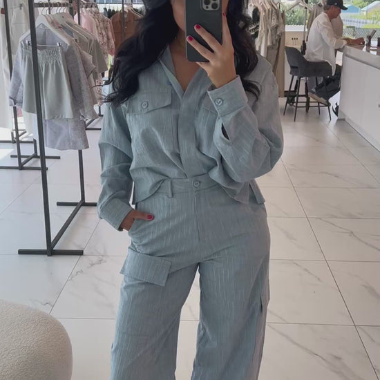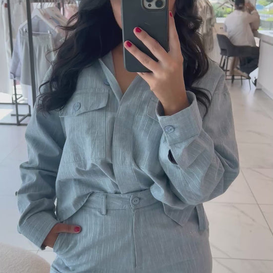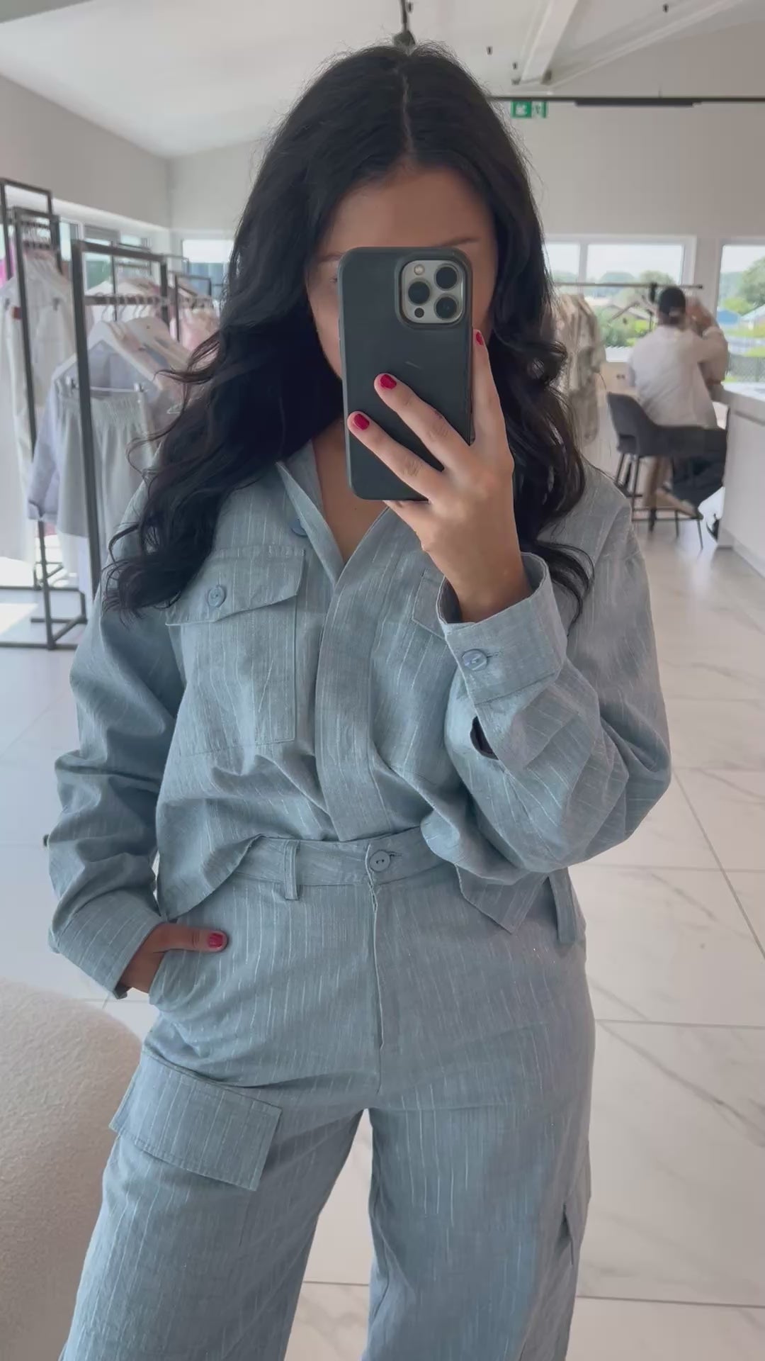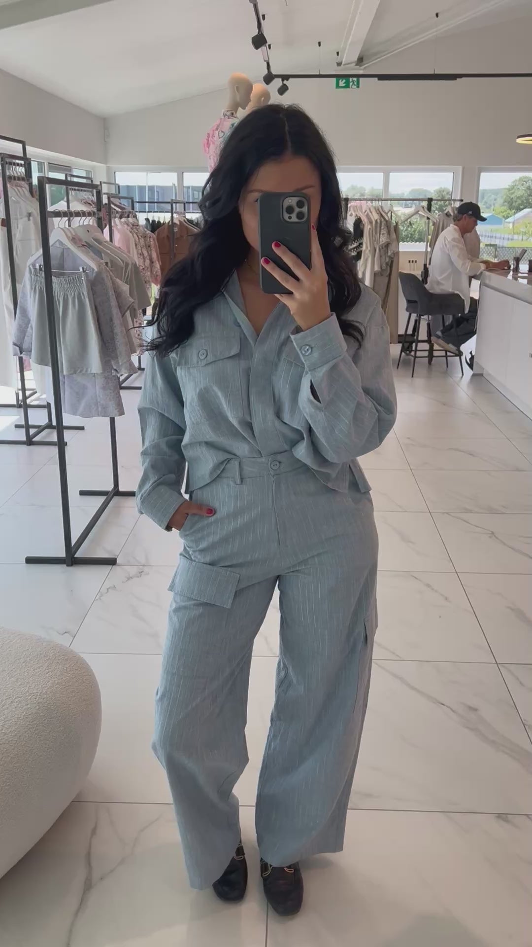 Keaton Trousers van het merk Est'Seven. Rechte broek met zakken op de zijnaad, opgestikte zakjes achterop en steekzakjes in een light denim stripe.