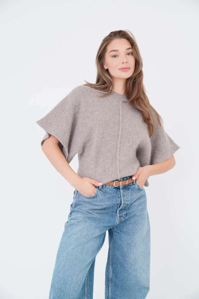 Ribbel pullover met ronde hals en wijd aangebreide mouwen.