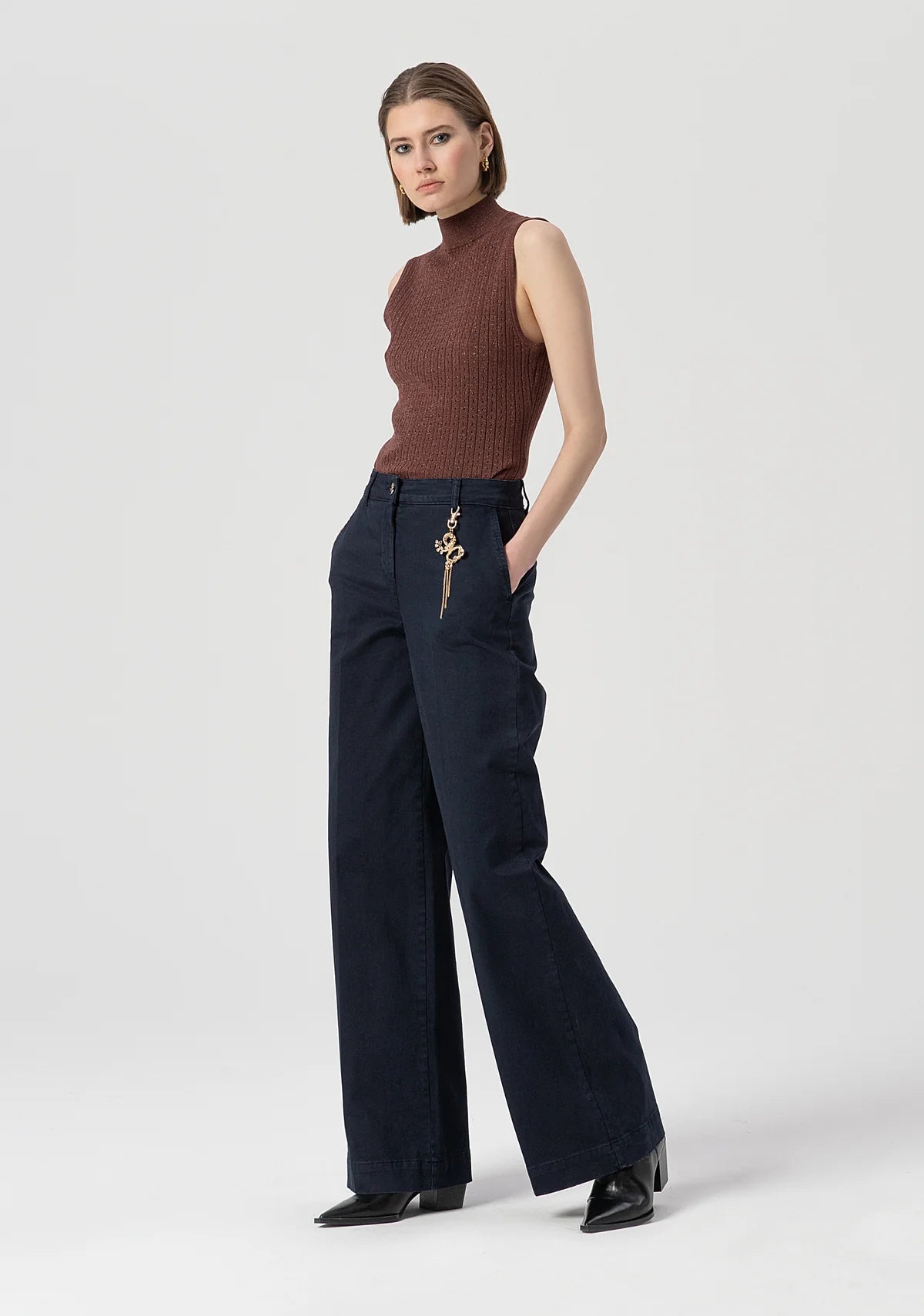 Palazzo pantalon met flared pijpen, gemaakt van gabardine. Normale taille, steekzakken, paspelzakken aan de achterkant en wijde pijpen.